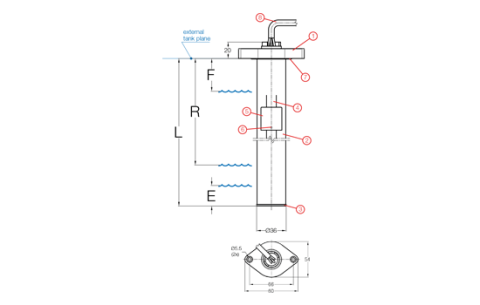 Fuel level sensor available in 28 lengths, up to 684 mm. Assembly with two screws. Assembly possible both at the bottom and at the top of the tank. Maximum versatility of use.
